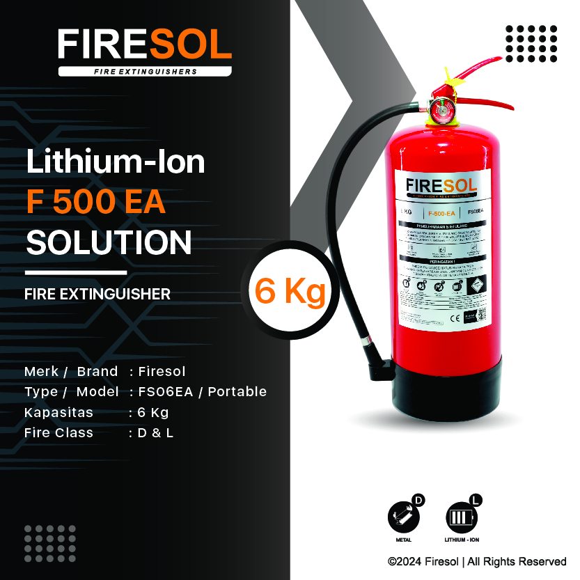 APAR FS50 Lithium-Ion 6Kg merek FIRESOL adalah Alat Pemadam Api Ringan (APAR) dengan media pemadam khusus berupa F-500 Encapsulator Agent untuk memadamkan kebakaran kelas L (Lithium-Ion) seperti battery mobil listrik, kebakaran kelas D akibat logam yang terbakar juga efektif memadamkan kebakaran kelas A (Kayu, kertas, kain, dll) dan kelas B (Minyak, solar, bensin, pelarut, dll) bahkan untuk jenis kebakaran Kelas K yang terjadi di dapur.